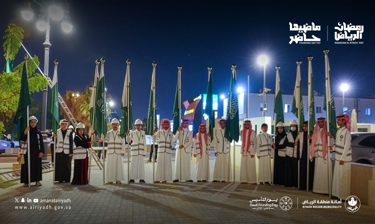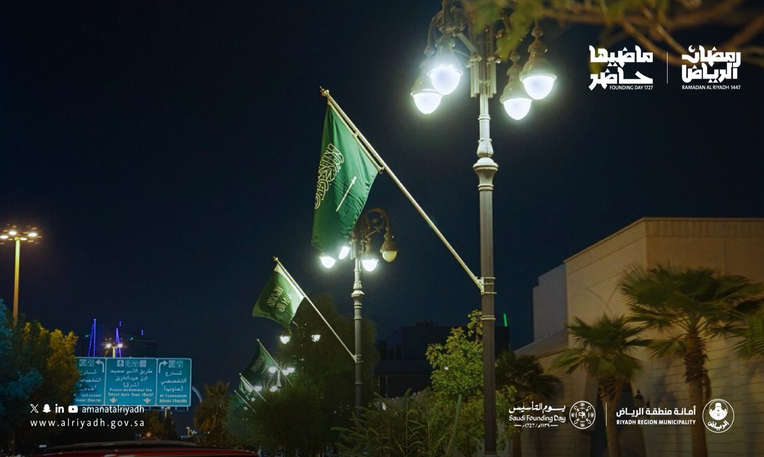 یومِ تاسیس کی مناسبت سے ریاض میونسپلٹی نے دارالحکومت اور اس سے ملحقہ علاقوں کو 25 ہزار سے زائد سعودی اور پہلی سعودی ریاست کے پرچموں سے سجا دیا۔